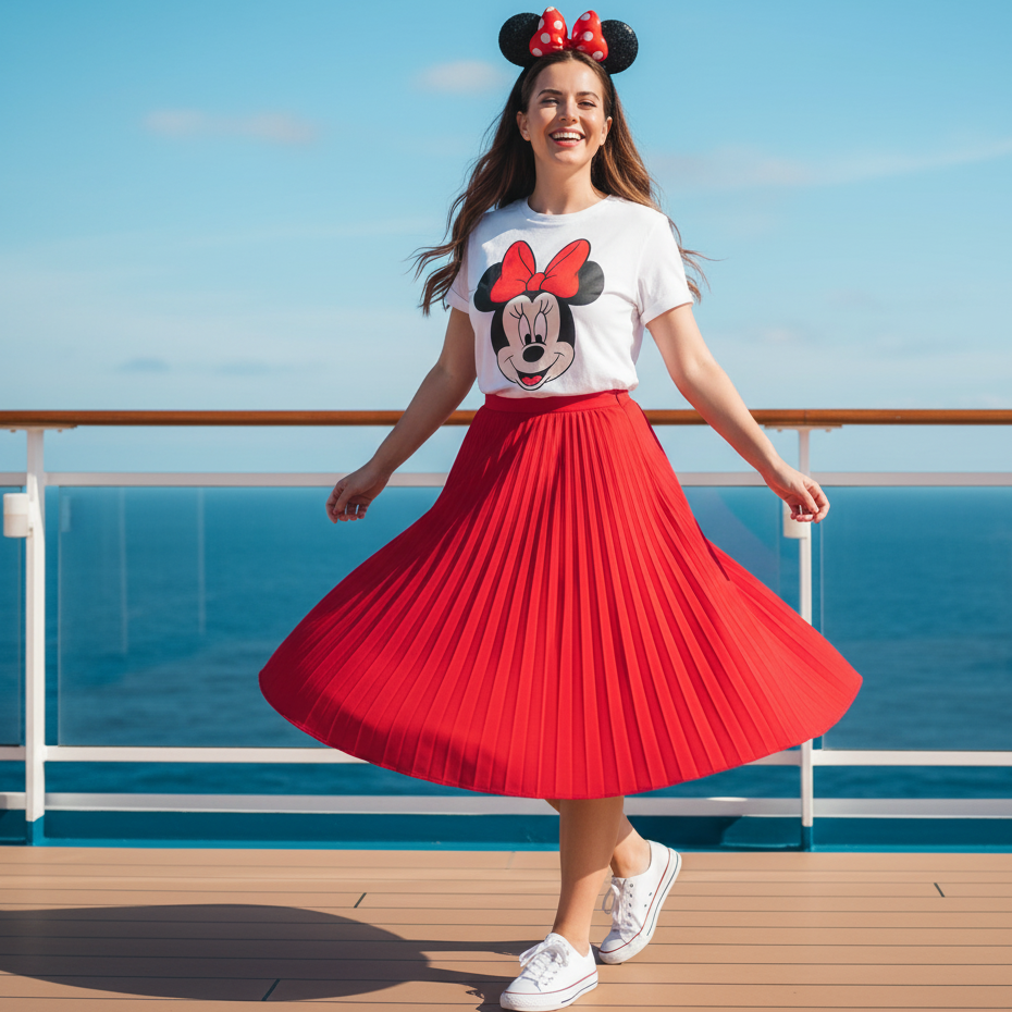 Pair a Minnie Mouse graphic tee with a red pleated skirt for a cute, retro-inspired Disney look. Add white sneakers, a bow headband, and dainty jewelry. This outfit perfectly captures the cheerful spirit of Disney while staying practical for shipboard adventures.