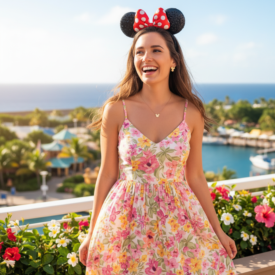 A floral sundress paired with Mickey or Minnie accessories adds subtle Disney magic to your outfit. Think floral headbands, small character pins, or a Mickey-shaped necklace. It’s a breezy, feminine look that’s ideal for brunch or exploring tropical ports.