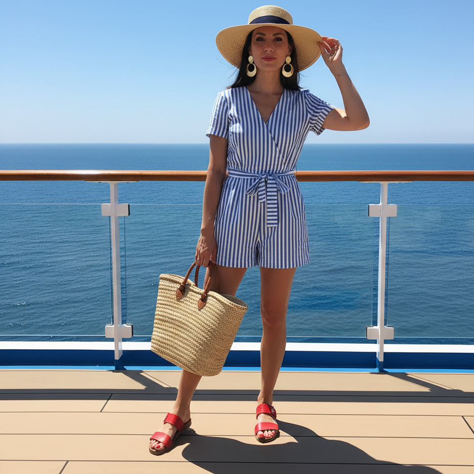 Perfect for sunny deck strolls, a blue-and-white striped romper gives off Disney nautical vibes. Pair it with red sandals and gold hoop earrings for a subtle nod to Mickey’s colors. Add a straw tote and sunhat for a cute and comfy seaside look that feels effortlessly themed.