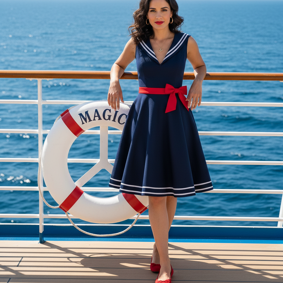 A navy sailor-inspired dress with white trim captures the perfect Disney cruise aesthetic. Pair it with red flats, gold accessories, and a white clutch for a chic nod to Minnie’s nautical wardrobe. It’s polished, playful, and perfect for themed dinner nights.