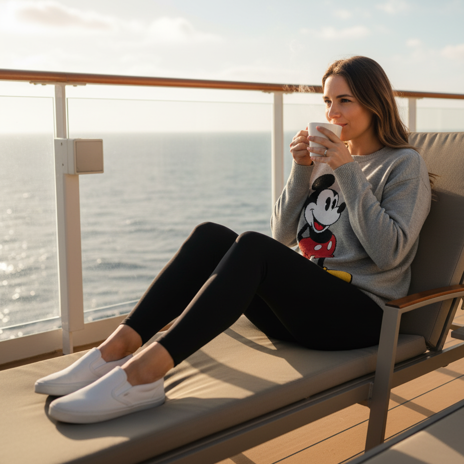 When temperatures drop on deck, cozy up in a Mickey Mouse sweater and black leggings. Add comfy slip-ons or sneakers for easy movement around the ship. It’s perfect for movie nights under the stars or early-morning coffee runs with a view of the sea.