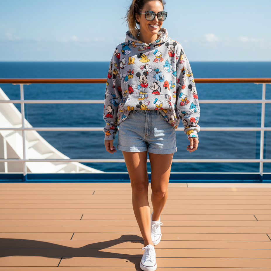 For laid-back sea days, wear a soft Disney hoodie featuring classic characters and pair it with denim shorts. Add comfy slip-ons and sunglasses for a relaxed, casual look. Ideal for exploring the ship, watching deck shows, or grabbing a treat at the ice cream bar.