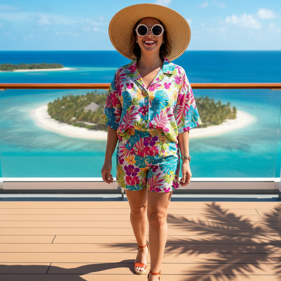 A tropical-print matching set with subtle Mickey silhouettes brings playful charm to your cruise wardrobe. Perfect for lounging on deck or heading to Castaway Cay. Pair with espadrilles, a sun hat, and statement sunglasses for a relaxed yet photo-ready island vibe.