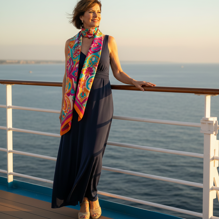For the ship’s gala or captain’s dinner, a floor-length gown in chiffon or satin makes a graceful statement. Go for jewel tones like sapphire, emerald, or champagne. Pair with elegant drop earrings and low metallic heels. The result: timeless sophistication that celebrates your confidence, beauty, and experience — all in one stunning outfit.