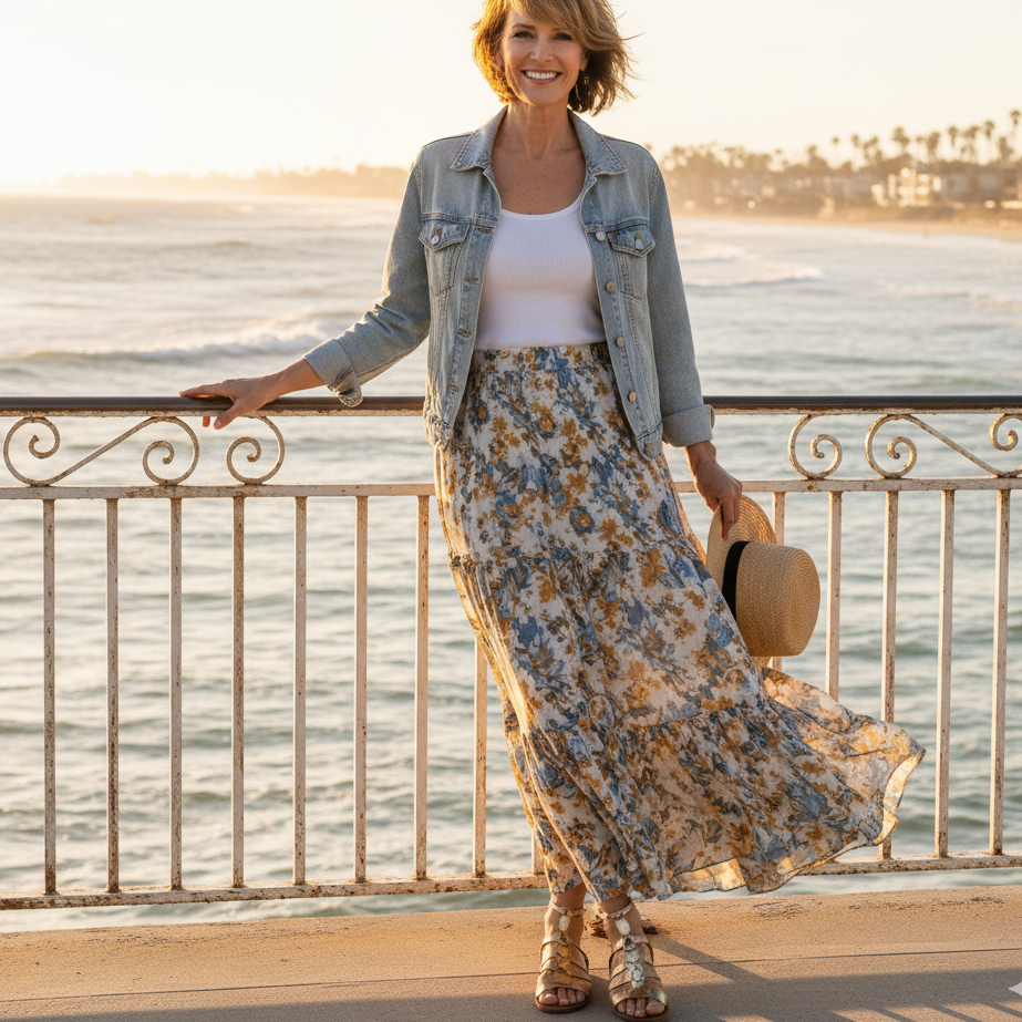 A breezy maxi skirt with a fitted tank top offers effortless style for warm days onboard. Go for breathable fabrics like cotton or viscose, and choose prints inspired by tropical leaves or soft florals. Add a denim jacket for layering and metallic sandals for an elegant finish that feels easy yet polished.