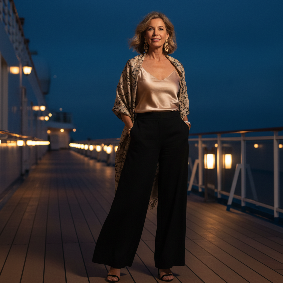 Palazzo pants paired with a silk camisole bring a blend of elegance and comfort to your evening wardrobe. The flow of the fabric flatters every body shape while feeling light and luxurious. Pair with strappy sandals, statement earrings, and a soft shawl for a look that shines at any cruise dinner event.