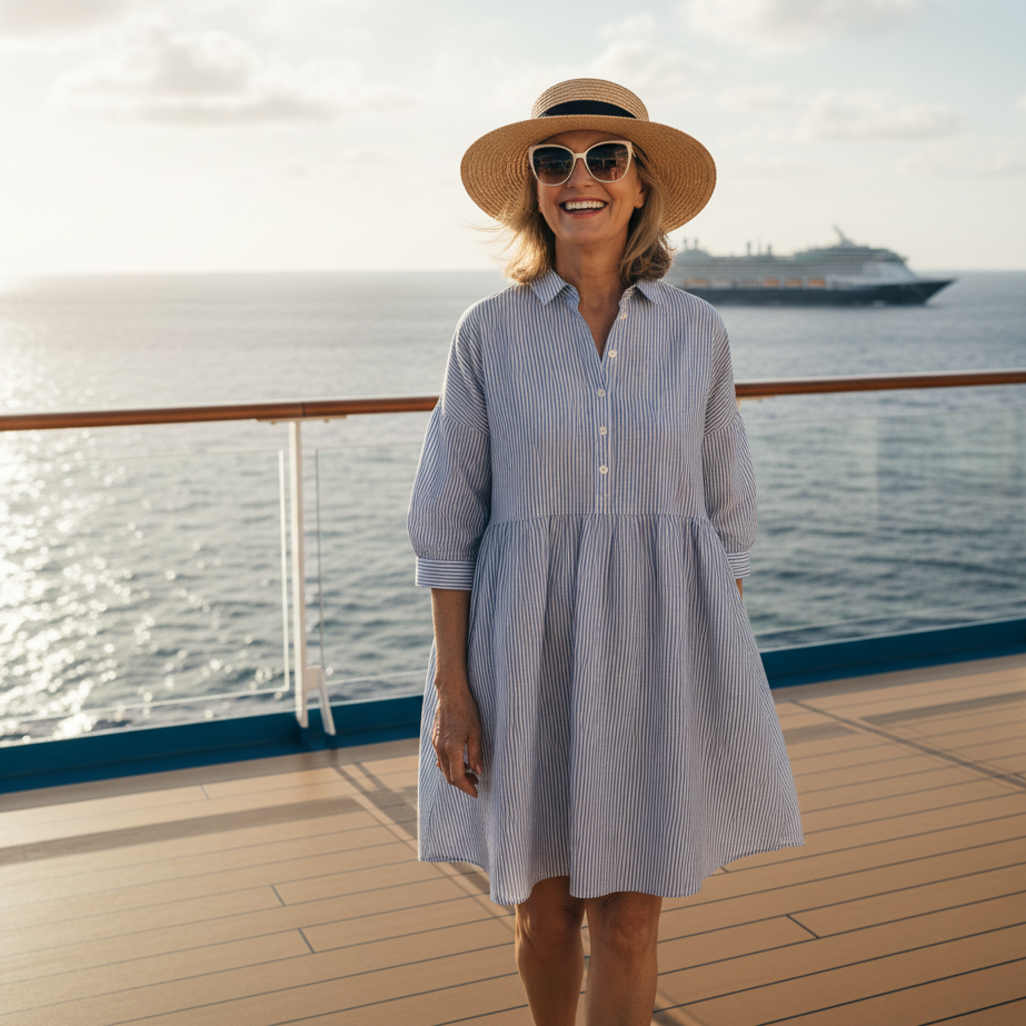 A cotton or linen day dress in a relaxed silhouette is ideal for strolling on deck or exploring tropical towns. Add a wide-brim straw hat, sunglasses, and comfy sandals. The simplicity of this look radiates timeless charm and keeps you effortlessly cool during sunny afternoons.