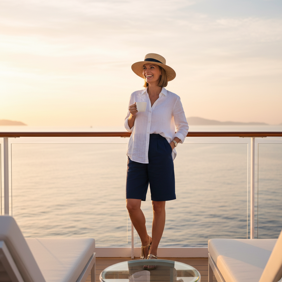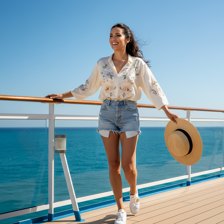 Light denim shorts with a tucked-in silk blouse and white sneakers. Casual yet polished for exploring the ship or relaxing by the rail.