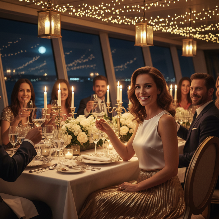 A silky navy slip dress with golden hoops and nude heels. Elegant, minimal, and perfect for romantic sunset dining on the upper deck.