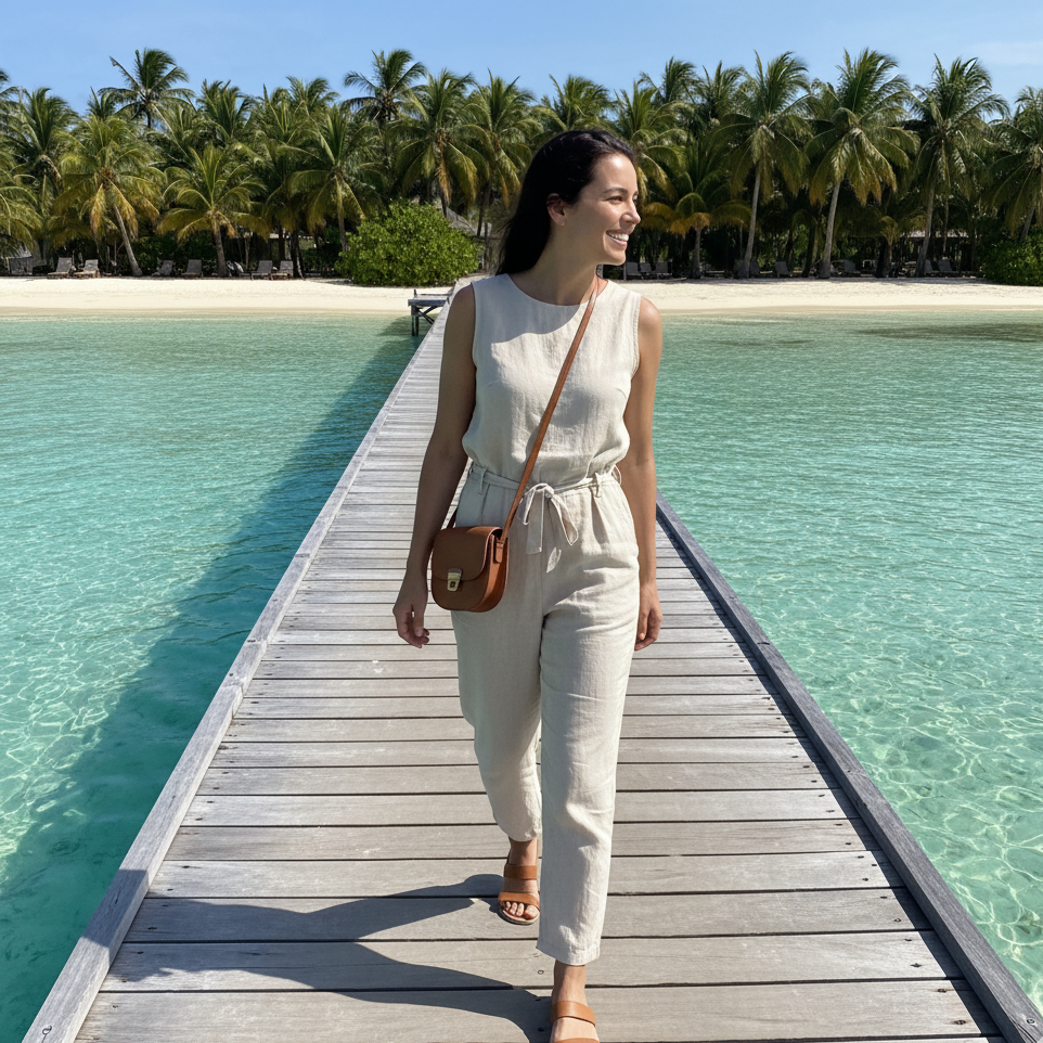 For shore adventures, wear a sleeveless linen jumpsuit with tan sandals and a crossbody bag. Light, breathable, and adventure-ready.