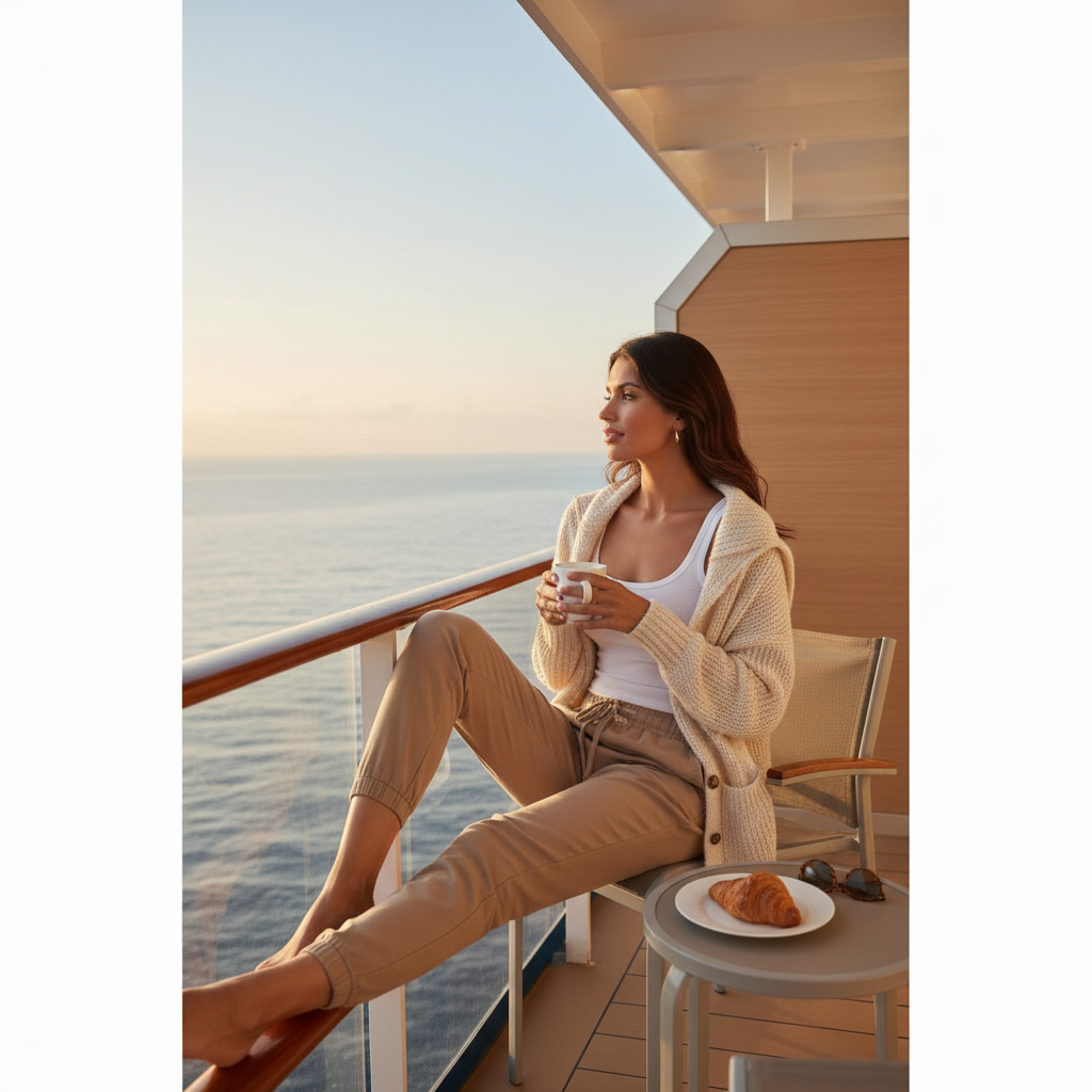 Soft beige joggers with a fitted white tank and lightweight cardigan. Perfect for embarkation or disembarkation days — comfort without compromise.