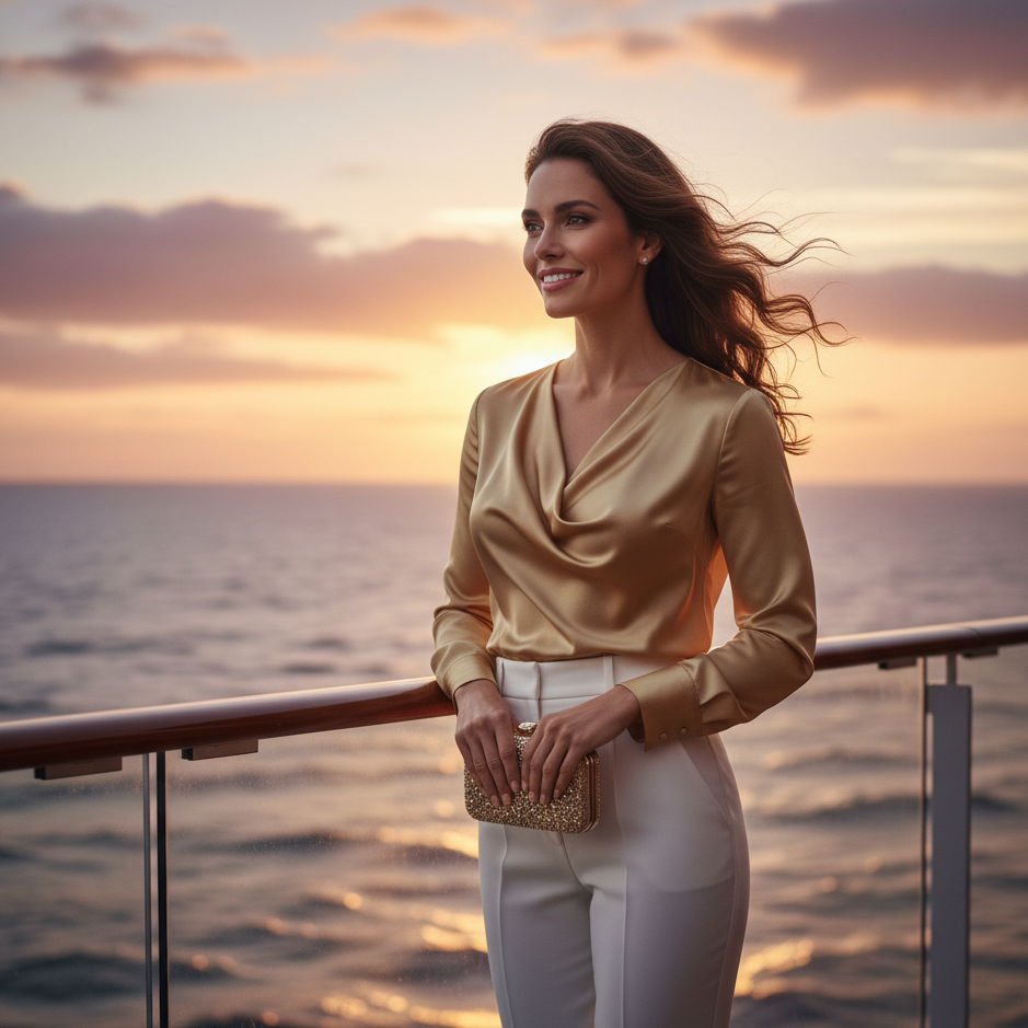 End the voyage in a statement look — a gold midi skirt, white satin top, and delicate sandals. Radiant, elegant, and perfect for the final dinner at sea.